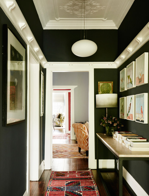 If using black in a high-traffic area such as the living room or kitchen is a little too bold for your tastes, consider it in a hallway instead. You can go all-in and slather everything in black or pair it with other dark tones.